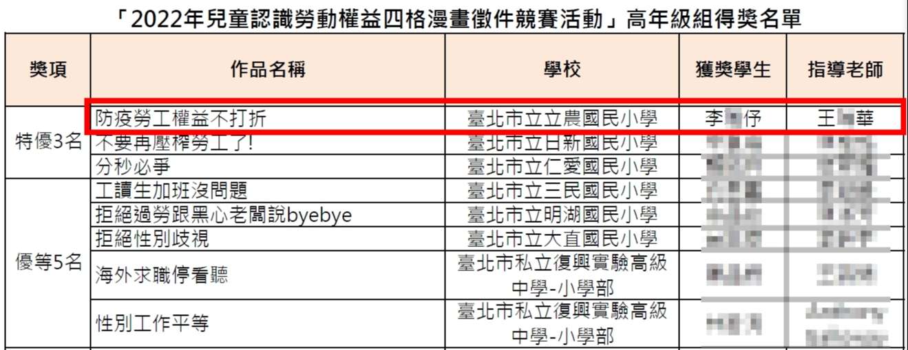 賀 本校高年級李O伃同學參加2022年「兒童認識勞動權益四格漫畫徵件競賽」榮獲 特優!!!
