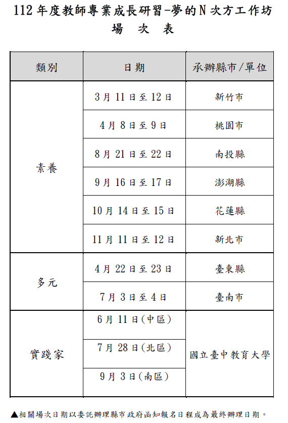 教育部國民及學前教育署辦理「112年度教師專業成長研習-夢的N次方工作坊」場次表