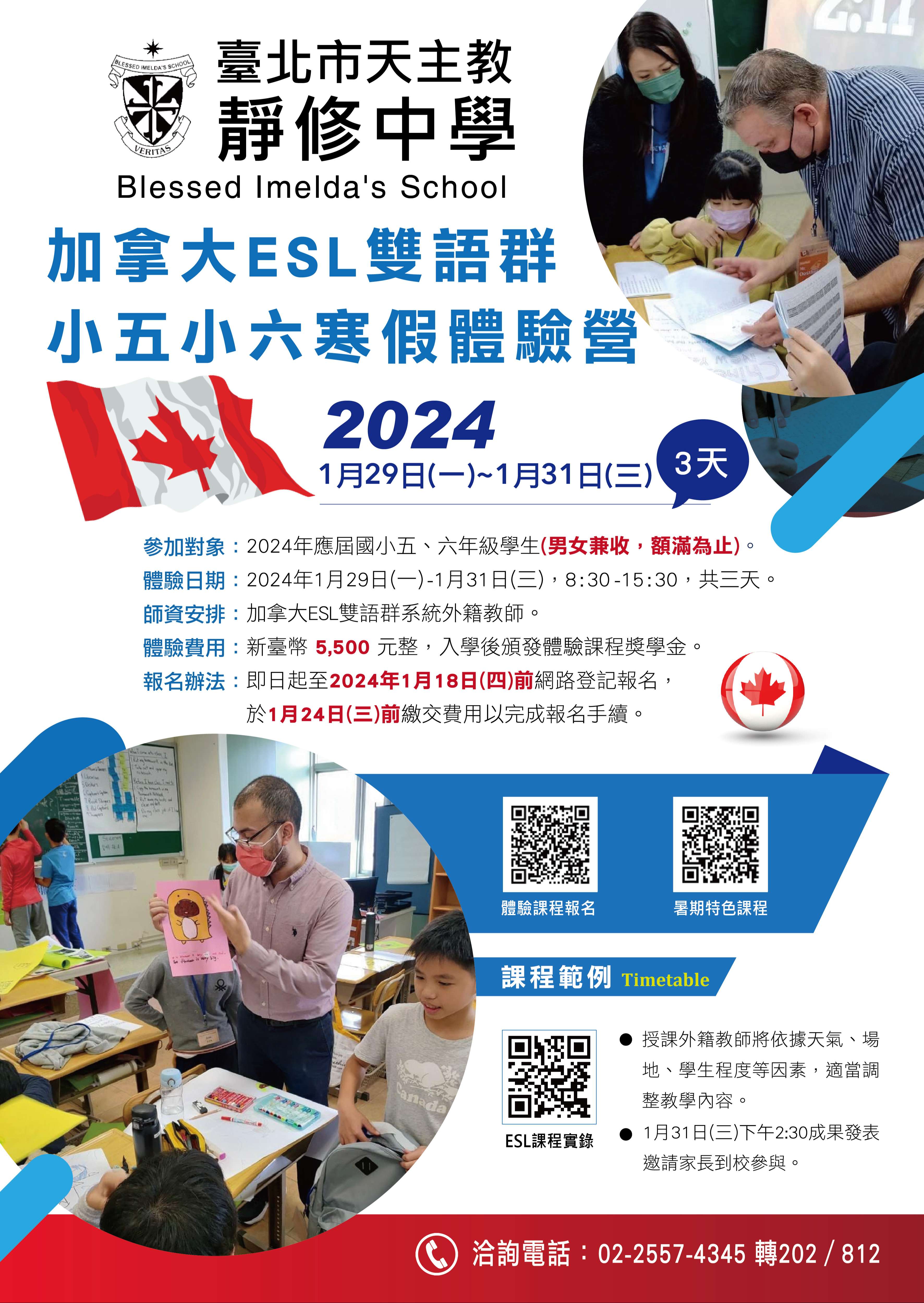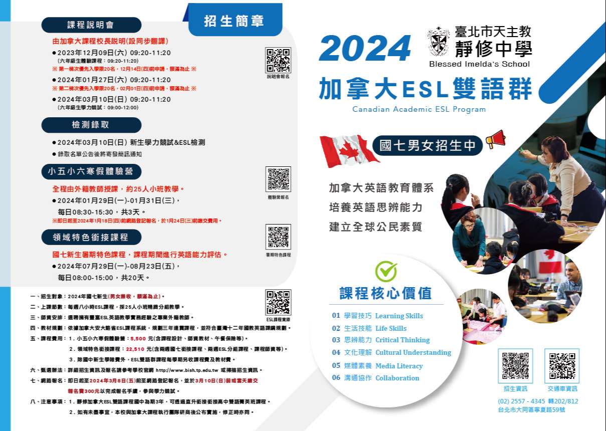 一、國中部加拿大雙語課程、全人菁英課程之入學資訊,舉辦招生說明會,如下所示: