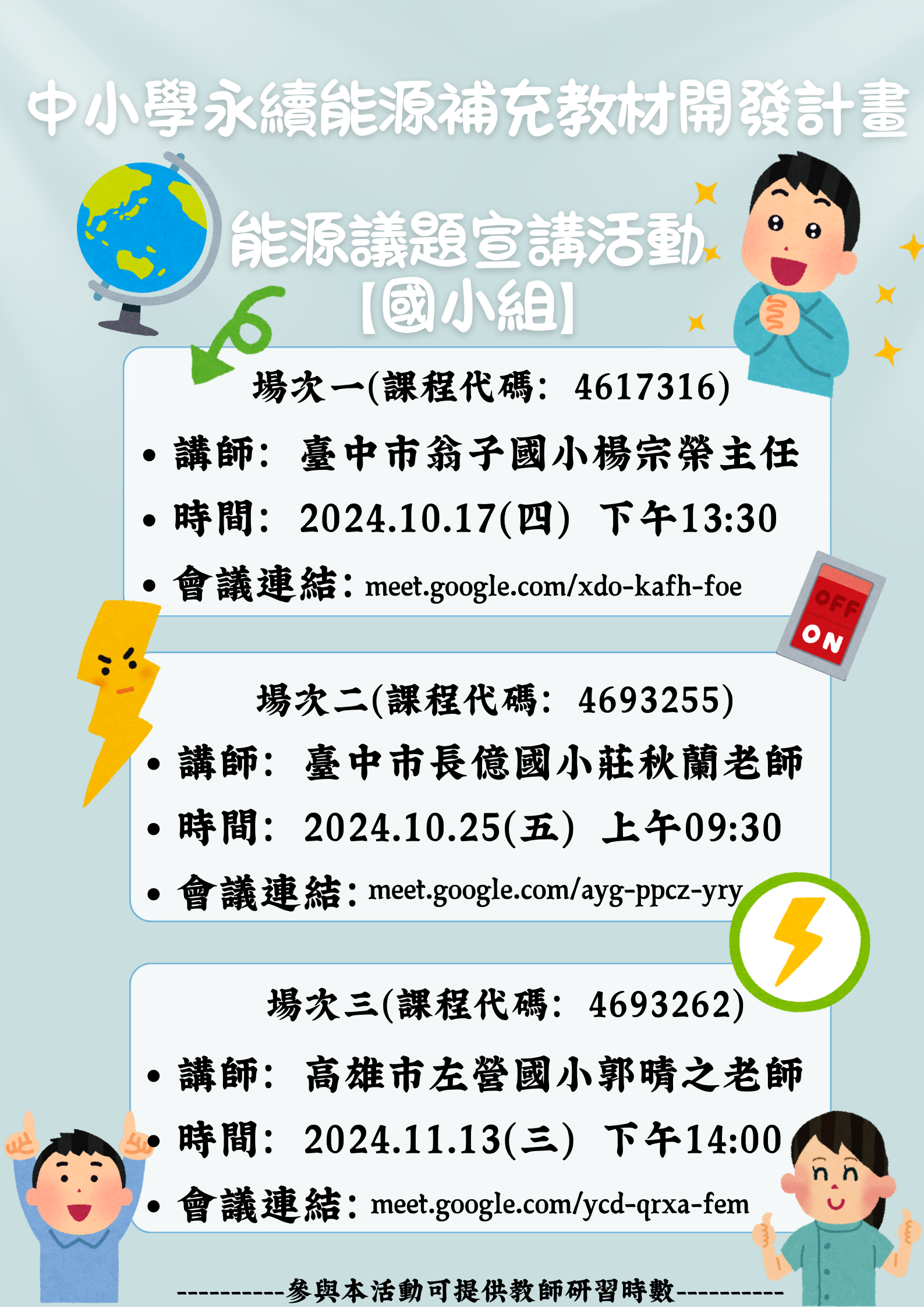 【國小組】場次一(課程代碼:4617316);講師:臺中 市翁子國小楊宗榮主任;時間:113年10月17日(星期 四)下午1時30分至3時;Google Meet連結:meet. google.com/xdo-kafh-foe。