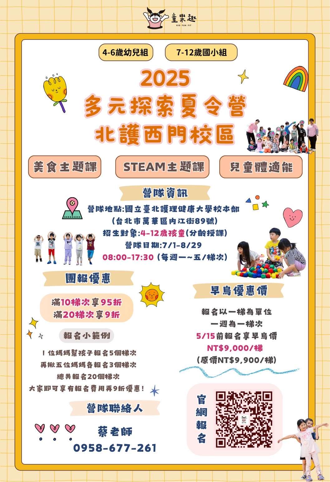 一、「2025西門校區-多元探索夏令營」謹訂於2025年07月 01日至08月29日開課,即日起受理報名。